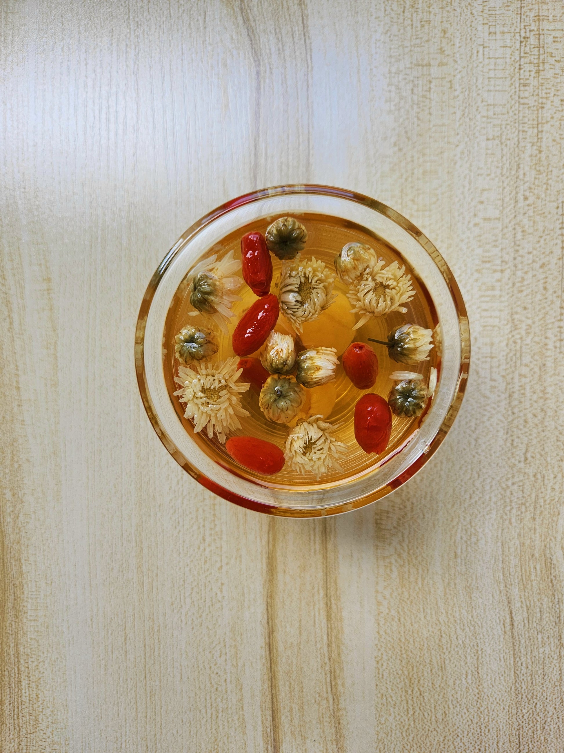 把4朵菊花、5粒枸杞和2幹桂圓肉放入8盎司沸水中,至少蓋上杯蓋,浸泡10分鐘後再飲用。